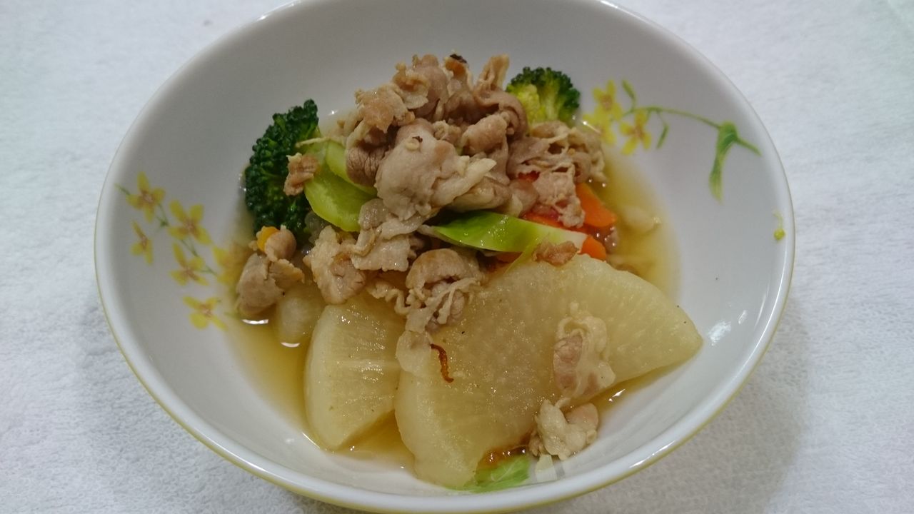 夕食 豚バラ肉と大根のスープ煮+キャベツ+レタス+きゅうりとわかめの酢の物+ポテトサラダ+柿+ドーナツ+ブルーベリーハーバー+ぬれせんべい