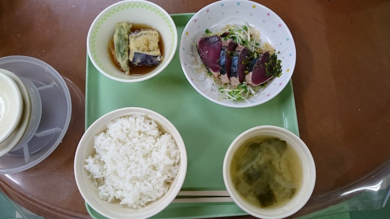 昼食 今日の病院食 かつおたたき 617カロリー+一本満足バー+ファミリーマート プレミアムクッキーシュー+生どら焼き+こだわりパン工房のパン2つ