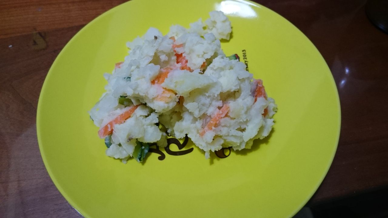 夕食 キャベツ+かにかま+ノンオイルドレッシング+じゃがいも茹でるとこから、ポテトサラダ☆+ジャーマンポテト♪+大根とホタテの煮物+焼き鮭+タコ(刺身)+大学芋+おはぎ